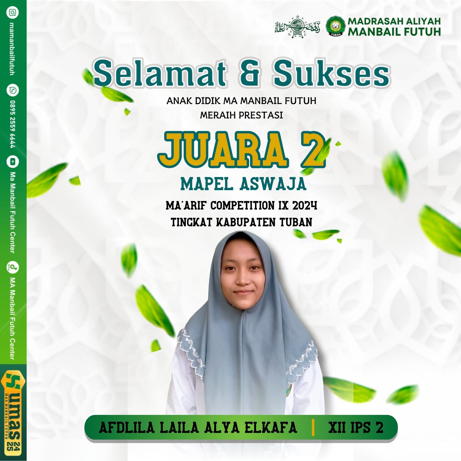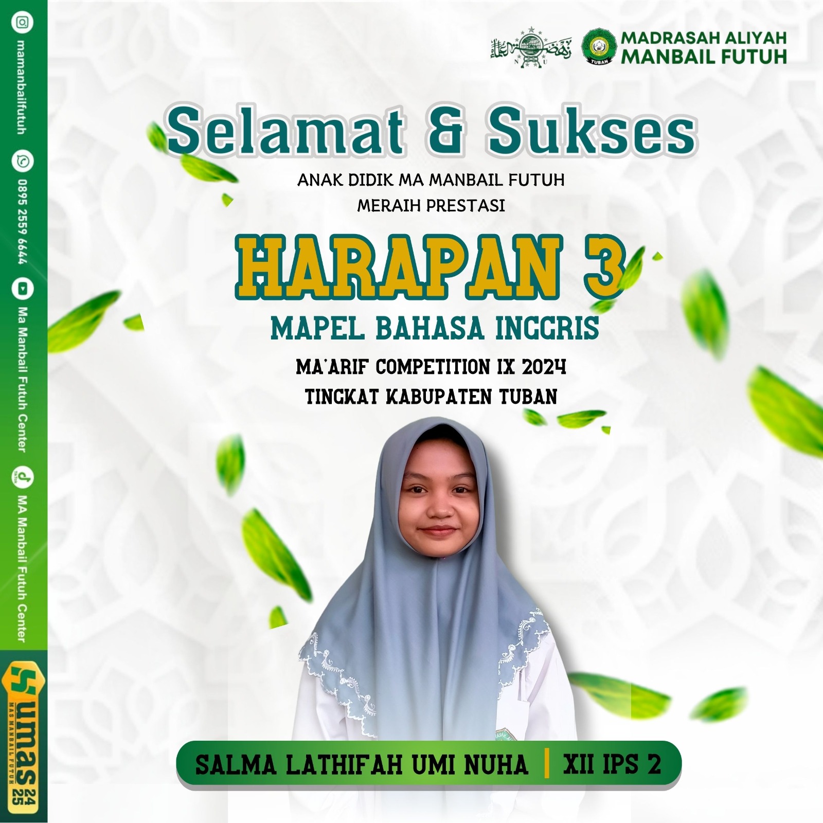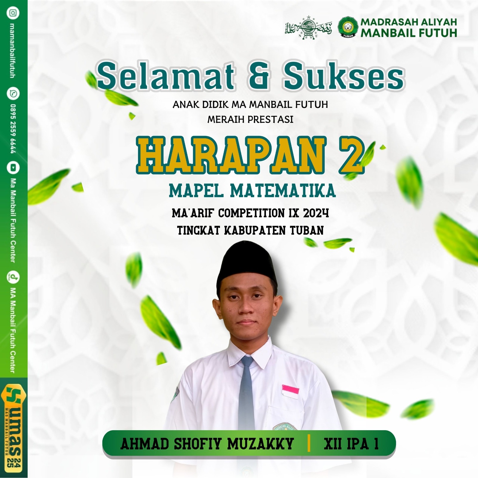 MA Manbail Futuh pada hari Rabu16 Oktober 2024 berhasil meraih berbagai juara dalam ajang Lomba Maarif Competition tahun ini. Lomba yang diadakan oleh PC. LP Ma'arif Tuban ini bertujuan untuk ajang silaturrahim dan ajang meraih prestasi.